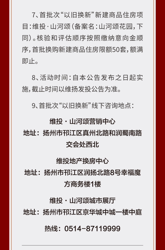 住房“以舊換新”“以房換房”是各地房地產(chǎn)新政中以“小細(xì)節(jié)”撬動(dòng)“大市場”的重要舉措。維揚(yáng)發(fā)投積極響應(yīng)政府新推行的“以舊換新”政策,踐行“惠民”理念,整合各項(xiàng)資源,搭建換房中心平臺(tái),為買房人提供一站式以舊換新置換服務(wù),推動(dòng)激活邗江區(qū)商品房市場活力。 此次維揚(yáng)發(fā)投“以舊換新”工作以其自主開發(fā)的維投·山河頌項(xiàng)目為試點(diǎn),由國企背書、置換范圍廣、全流程專業(yè)服務(wù)。首批換購新建商品住房限額50套,換購人可通過登錄“維揚(yáng)發(fā)投商品住房‘以舊換新’線上報(bào)名系統(tǒng)”報(bào)名,具體要求詳見公告。