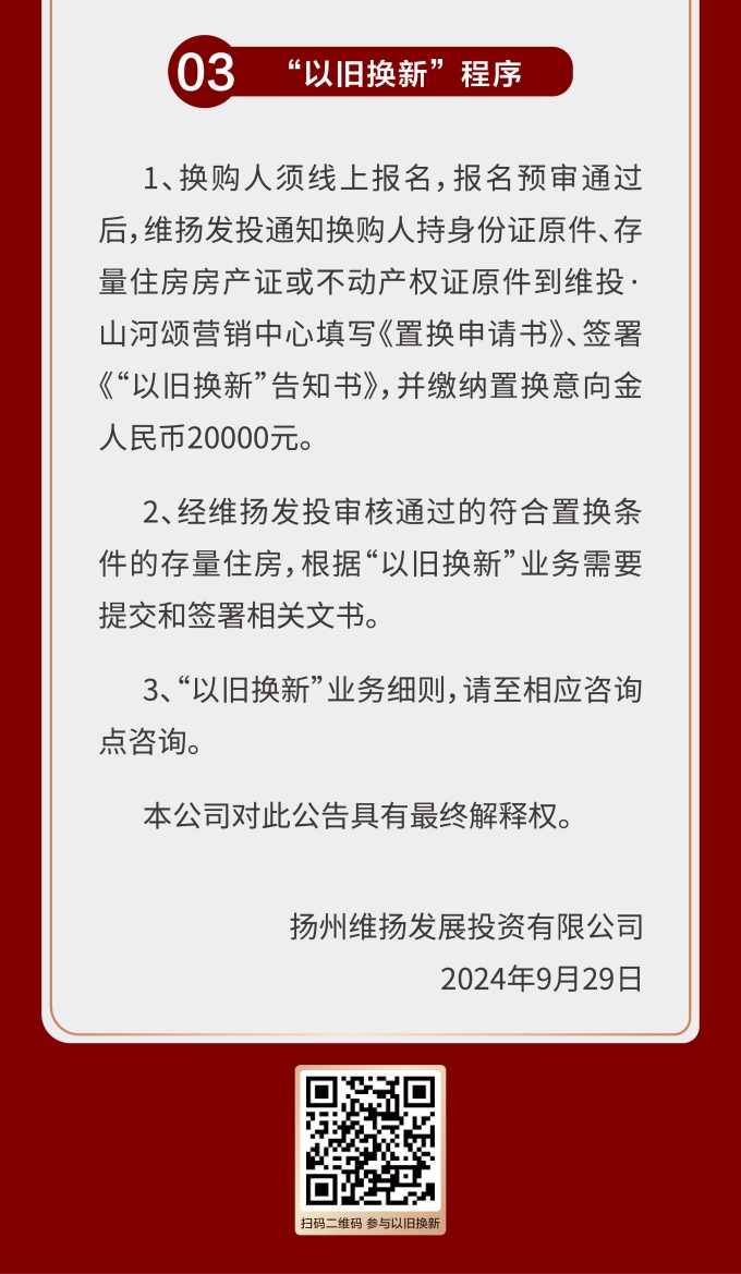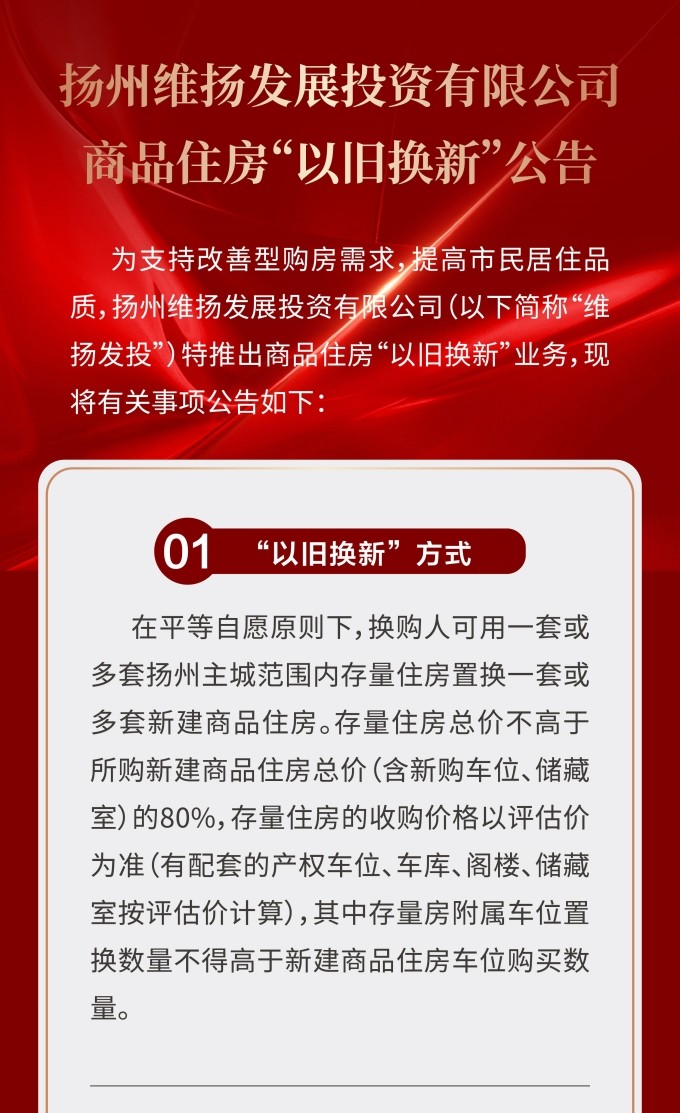 維揚地產(chǎn)積極響應(yīng)政府新推行的“以舊換新”政策,踐行“惠民”理念,打造高品質(zhì)住宅,滿足揚州人民改善型住房需求。此次維揚發(fā)投“以舊換新”工作以其自主開發(fā)的維投·山河頌項目為試點,由國企背書、置換范圍廣、全流程專業(yè)服務(wù)。首批換購新建商品住房限額50套,換購人可通過登錄“維揚發(fā)投商品住房‘以舊換新’線上報名系統(tǒng)”報名,具體要求詳見公告。